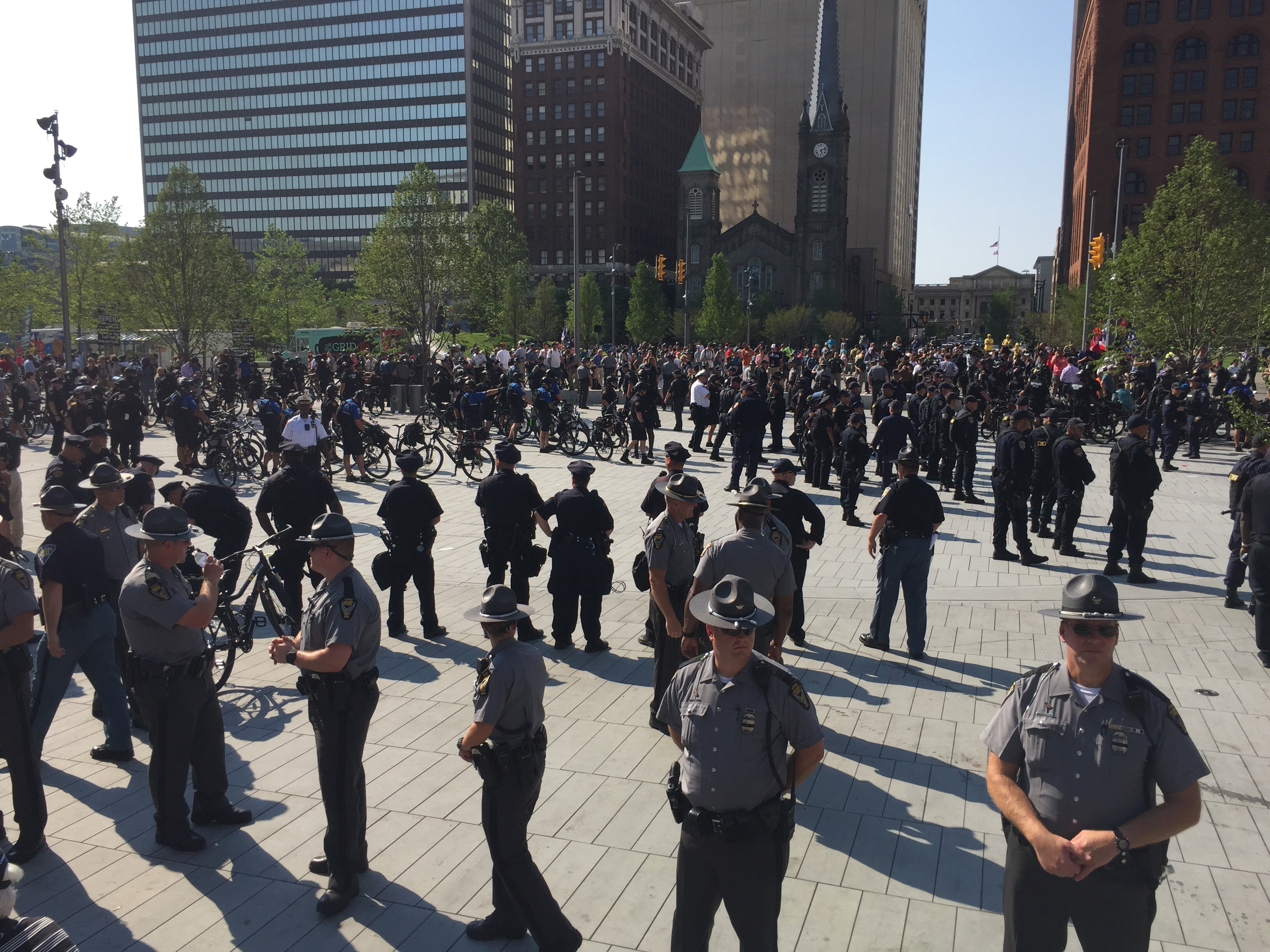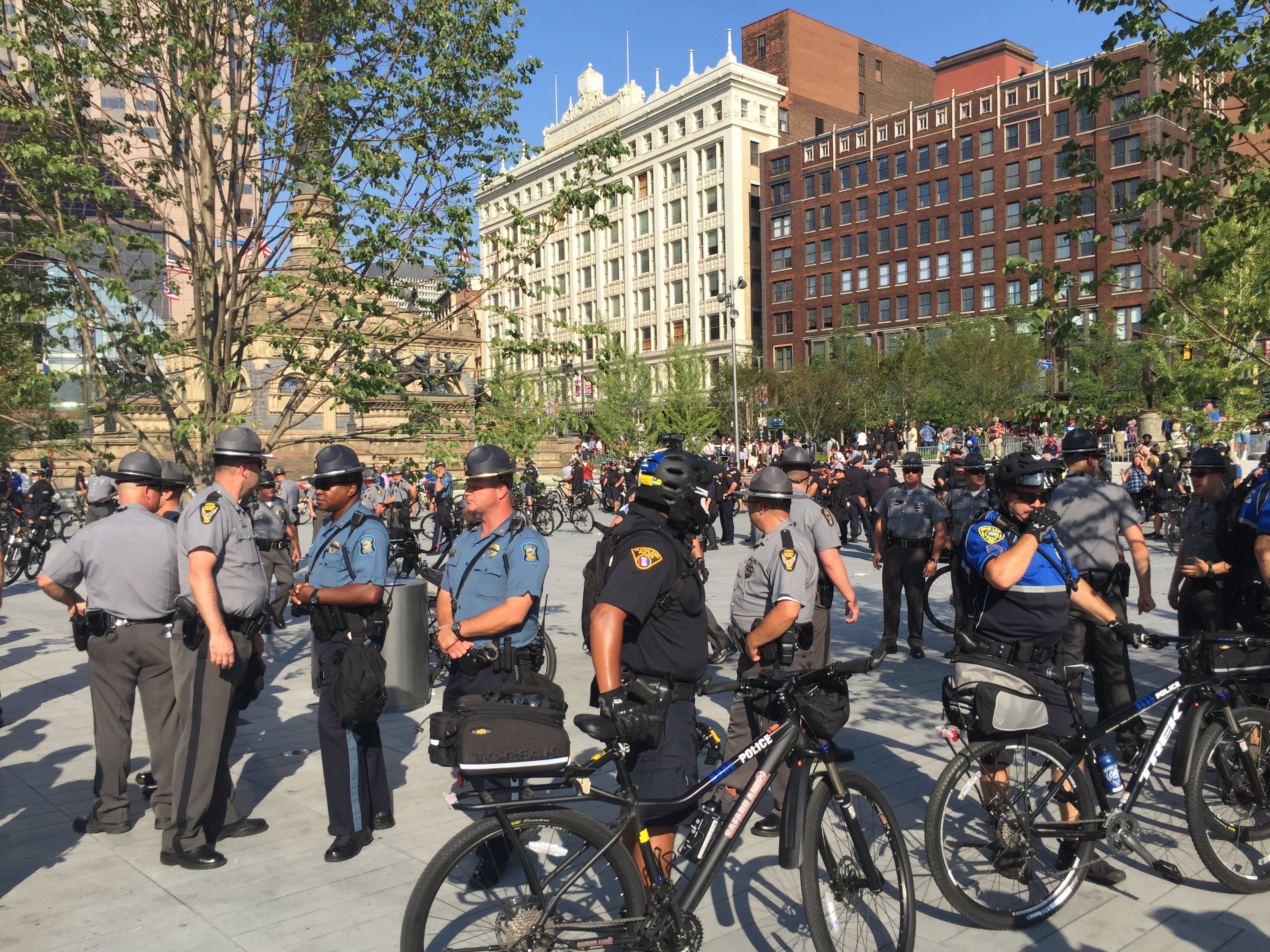 For the past hour and a half, police have gradually pushed demonstrators and other members of the public out of the center of Public Square in Cleveland, the site of 2016’s Republican National Convention.